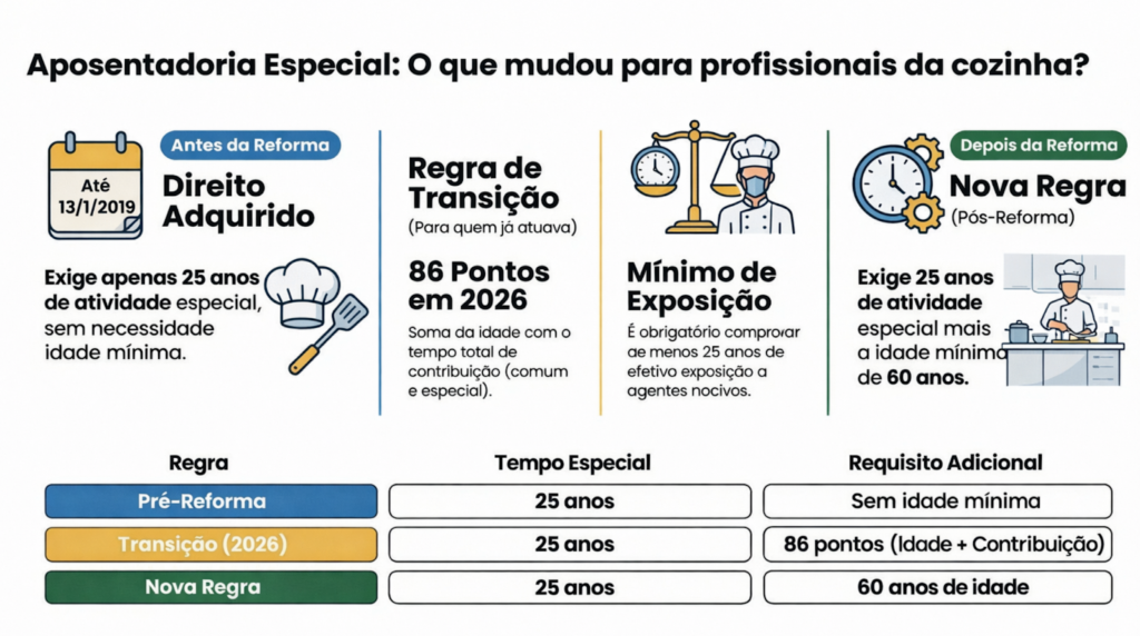 A regra de transição é destinada a quem já trabalhou em cozinhas antes da Reforma, mas ainda não tinha o tempo completo. Em 2026, o segurado precisa atingir a soma de 86 pontos para ter acesso ao benefício. Essa pontuação é o resultado da soma da idade atual com o tempo total de contribuição (comum e especial). É obrigatório que, dentro desse cálculo, o trabalhador comprove ao menos 25 anos de efetiva exposição aos agentes nocivos.