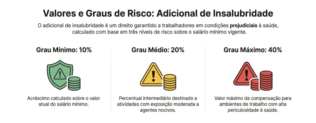 - Grau Mínimo: Acréscimo de 10% sobre o salário mínimo.