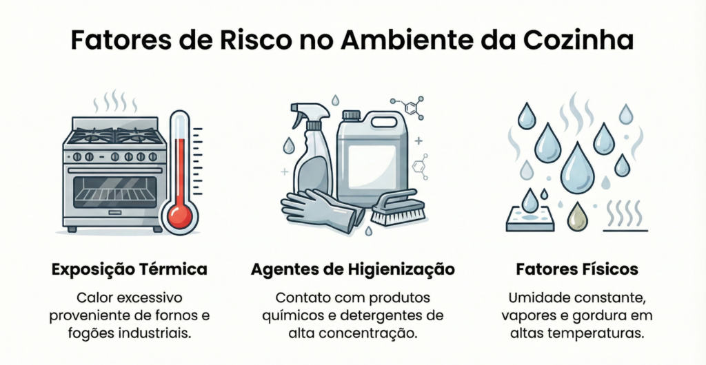 - Exposição Térmica: Calor excessivo proveniente de fornos e fogões industriais.