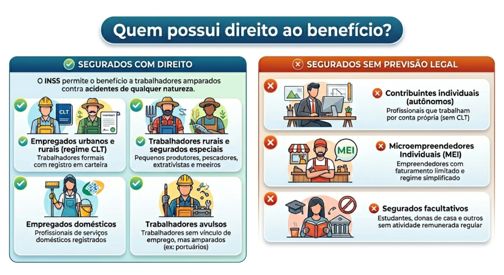 - Qualidade de segurado: É necessário estar em dia com as contribuições ou dentro do “período de graça” no momento do acidente.