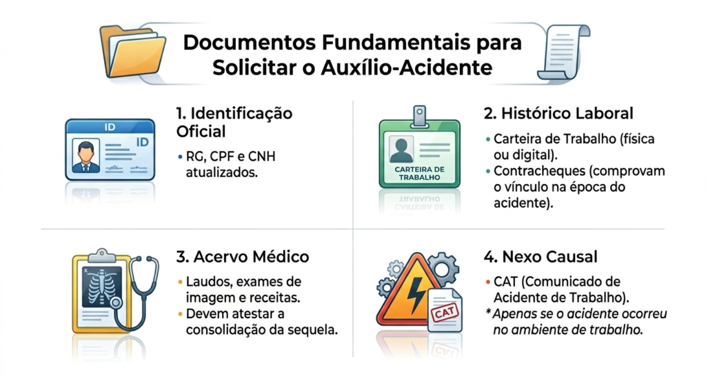 - Histórico Laboral: Carteira de Trabalho (física ou digital) e contracheques que comprovem o vínculo no momento do acidente;
