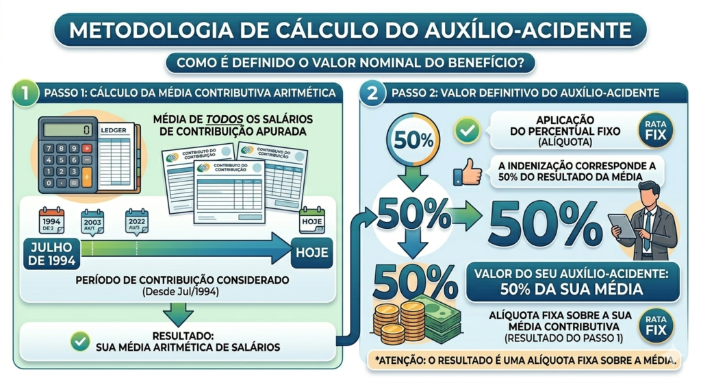 O valor nominal do auxílio-acidente é definido por uma alíquota fixa sobre a média contributiva do segurado.