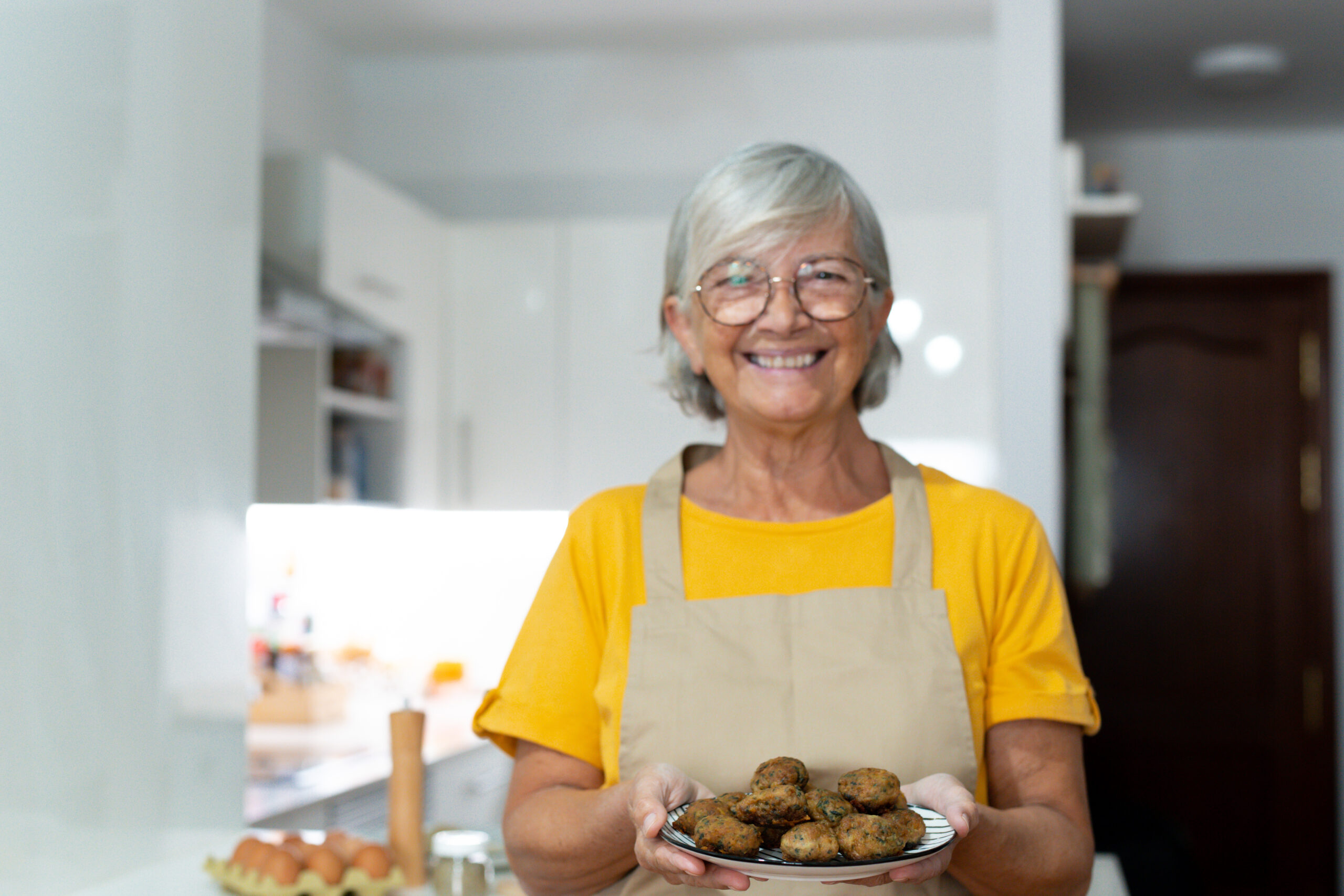Idosa sorridente de avental segurando prato de alimentos, representando a dona de casa e seu direito à aposentadoria pelo INSS.